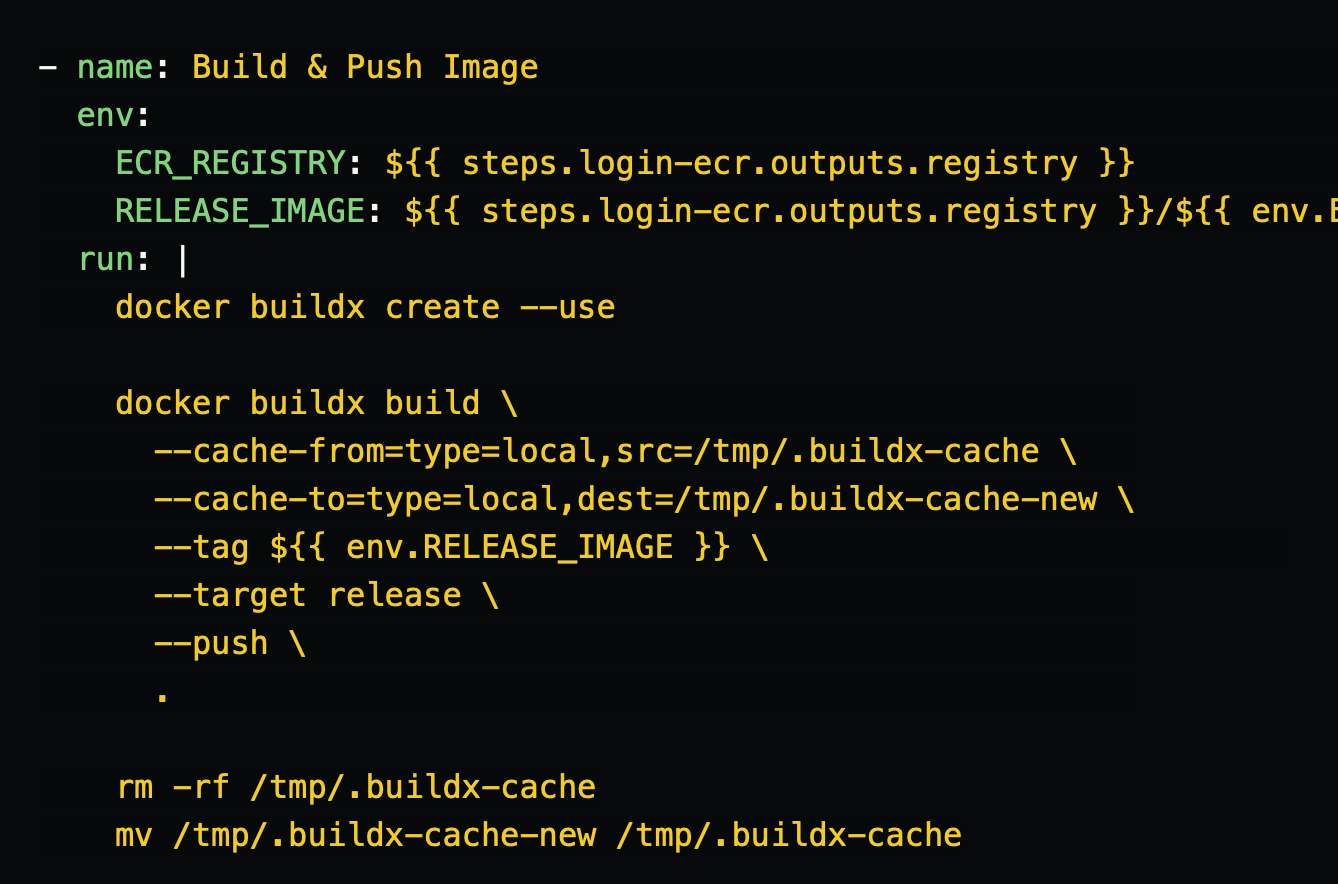 This step covers building the Docker image with buildx to optimize build time, and pushing it to AWS ECR, which was previously configured in “Login to Amazon ECR”.