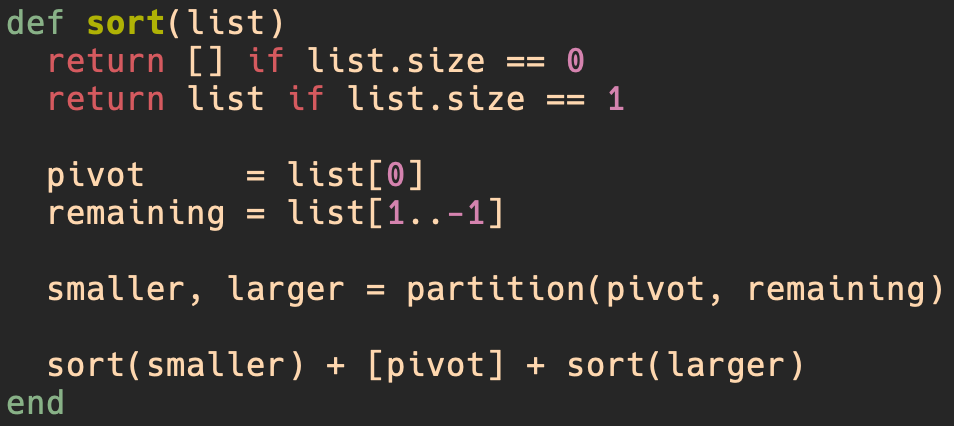 # Sorted = sort(smaller) + [pivot] + sort(larger)