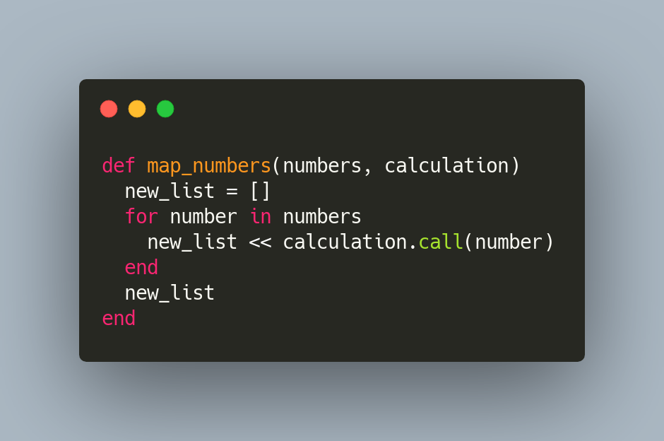 map_numbers(numbers, multiply_by_2) # => [2, 4, 6]